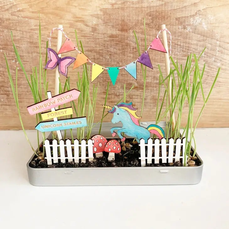 This kit contains wooden shapes, watercolor pencils and a paintbrush to create and assemble a magical garden scene.