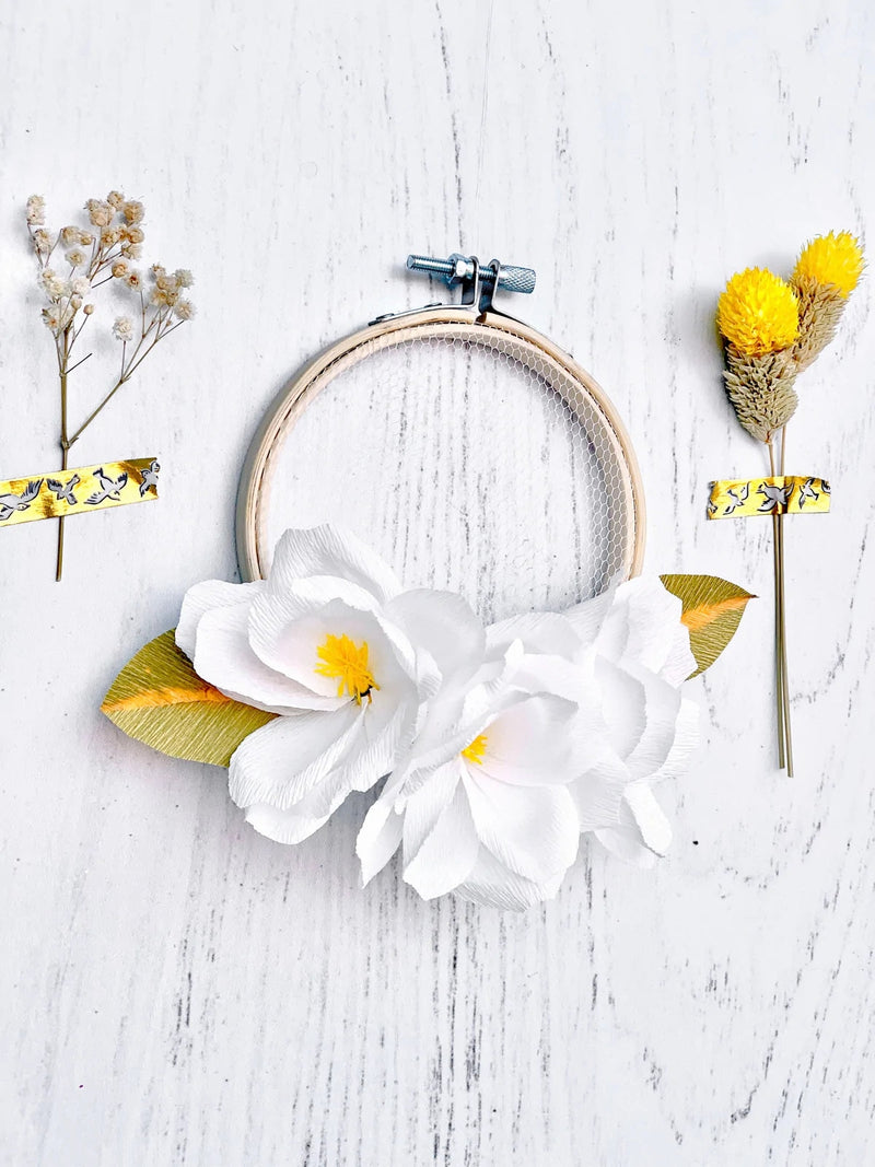Thanks to our progressive method for learn floral art , create this first creation with ease. In this manual activity box for adults , the cutting templates, pre-cut papers, tiger threads and the embroidery hoop are included.