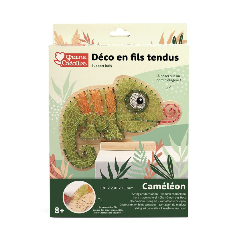 The String Art Chameleon kit allows your child to create, alone or with others, a pretty decoration in stretched string , to put in his room. Thanks to the pre-studded wooden support and the colored strings provided, he just has to follow the instructions to create a fun and stylish chameleon . A fun and creative way to develop fine motor skills , concentration and a taste for DIY, while creating an original decorative object!