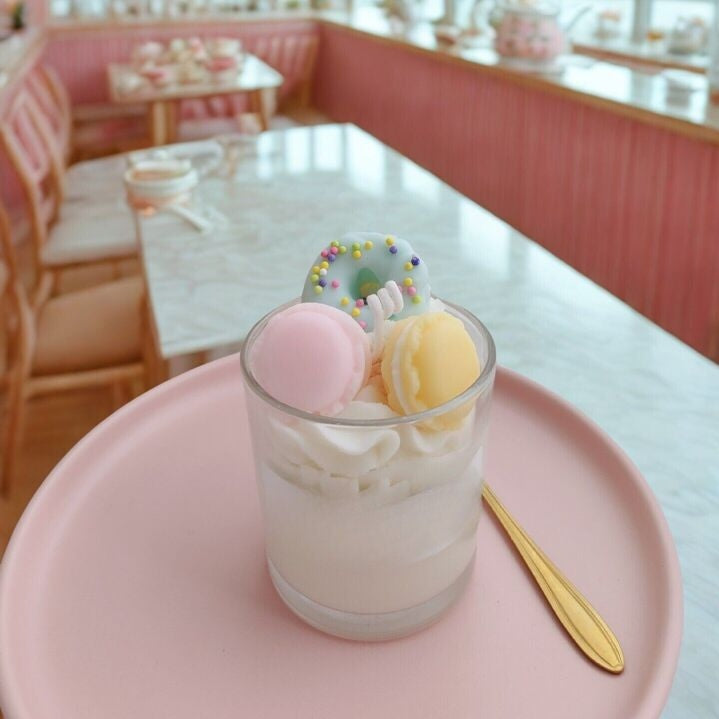 Véritable trompe-l’œil décoratif, cette bougie parfumée est un petit bijou de design kawaii, ornée de mini-macarons pastel et d’un donut gourmand aux couleurs tendres.